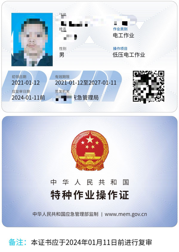 從2020年3月份起,高壓電工證書以新版的證書統(tǒng)一印制,分為電子證和實(shí)體證兩種類型,證書由相關(guān)部門頒發(fā),有效期是6年,每3年復(fù)審一次。