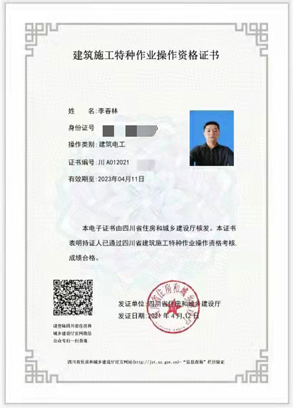 建筑電工證書展示: