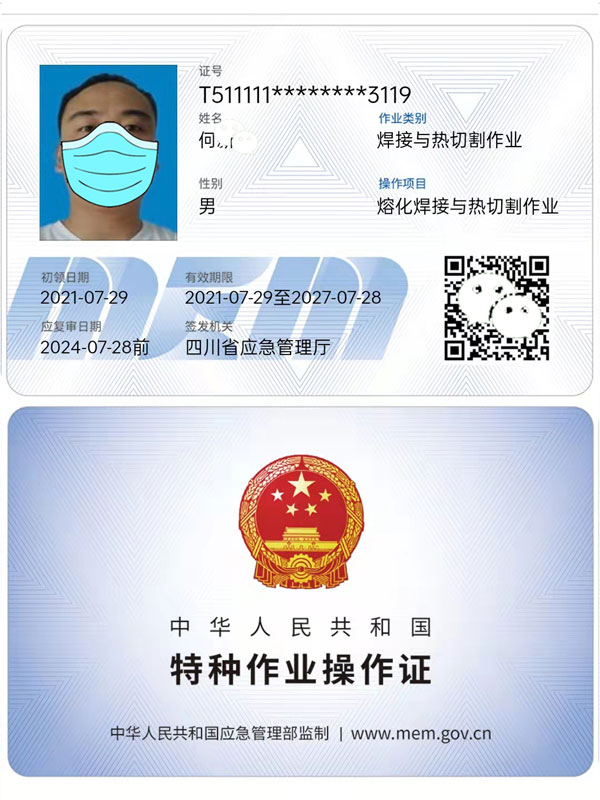 1.焊工特種作業操作證,也就是上崗證。這個證書屬于應急管理局管理,也就是大家最經常用到的焊工證,跟身份證大小的IC卡。這個是所有焊工都需要準備好的證書,焊工是特種作業需要持證上班,說的就是這個證書。