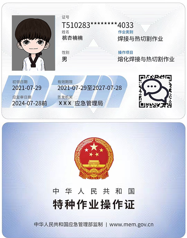 俗稱焊工操作證,焊工上崗證。也是大家去考的必要證件 由安全生產監督管理局即安監局頒發,是類似于身份證的IC卡證件,全稱是融化焊接與熱切割作業。 這個證書主要是說明你有此工種的安全操作的知識和能力,畢竟是上崗證 有效期六年,每三年一審,復審時間前2-3個月申請復審即可。此證全國通用。