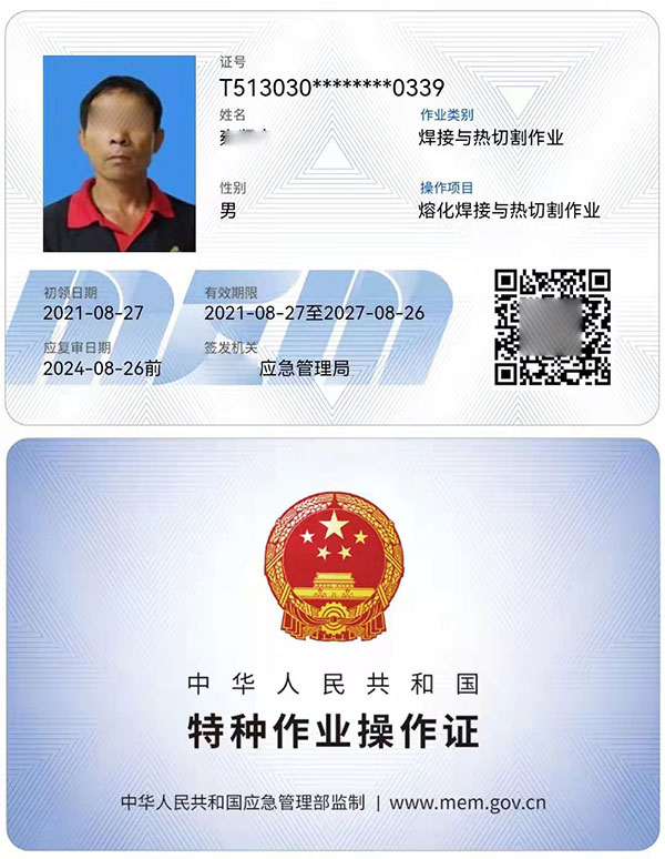 1,俗稱焊工操作證,焊工上崗證。也是大家去考的必要證件 由安全生產監督管理局即安監局頒發,是類似于身份證的IC卡證件,全稱是融化焊接與熱切割作業。 這個證書主要是說明你有此工種的安全操作的知識和能力,畢竟是上崗證 有效期六年,每三年一審,復審時間前2-3個月申請復審即可。此證全國通用。