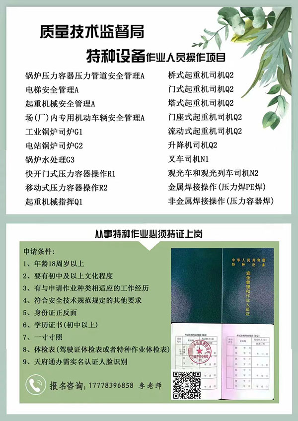 四川省質量技術監督局《特種設備作業證》報名咨詢電話:李老師:177-7839-6858(微信同號),隨時報名,周周考試,國網查詢,全國通用,新訓,復審,同步進行!