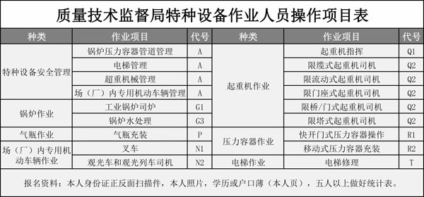 叉車證-全國叉車上牌,電梯維修,特種安全設(shè)備管理,起重機指揮,起重司機(限門座式起重機),起重司機(限橋式起重機),起重司機(限門式起重機),起重司機(限纜索式起重機),起重司機(限塔式起重機)起重司機(限流動式起重機)起重司機(限升降機),觀光和觀光列出司機,鍋爐壓力容器壓力管道管理,電梯管理,起重機械管理,場(廠)內(nèi)專用機動車輛管理,工業(yè)鍋爐司爐,電站鍋爐司爐,鍋爐水處理,快開門式壓力容器操作,移動式壓力容器充裝,氣瓶充裝,金屬焊接操作-壓力焊PE焊,非金屬焊接操作-壓力容器焊,食品檢驗員,化學(xué)檢驗員,農(nóng)產(chǎn)品檢驗員(4年一審,需要到期前3個月進行)